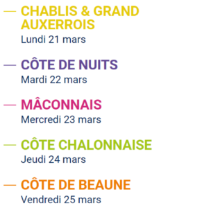 Du 21 au 25 mars 2022, ils pourront découvrir les derniers millésimes des 84 appellations de Bourgogne, cinq jours durant au travers de 12 dégustations dans 10 lieux différents de Chablis à Mercurey. 1 000 exposants, vignerons et négociants, offriront à la dégustation près de 6 000 vins. Au programme : immersion dans les terroirs bourguignons, échanges et partage, plaisir et convivialité, découvertes et rencontres…