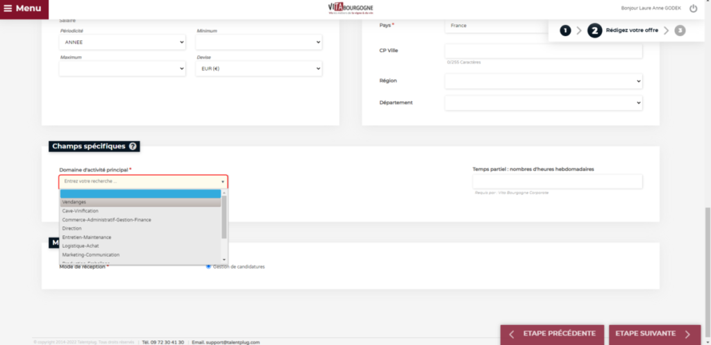Pour s’assurer que votre offre d’emploi est répertoriée sur cette page, assurez vous de bien sélectionner la ligne « vendanges » pour le champ « domaine d’activité principal ».